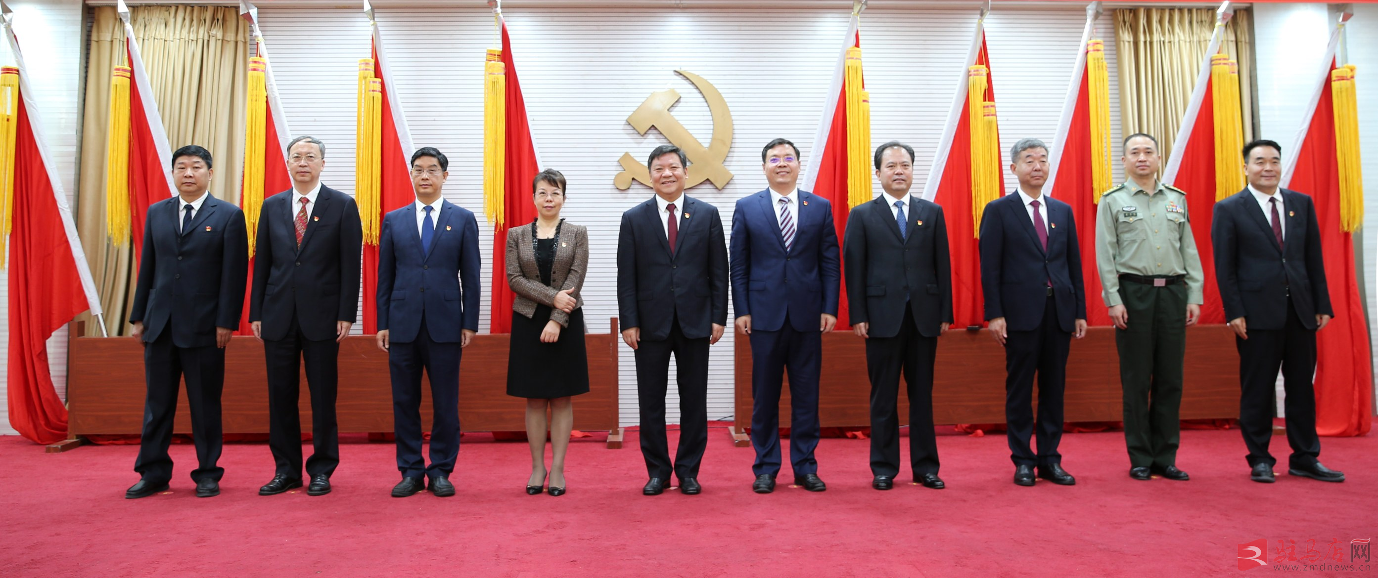 9月23日,中国共产党驻马店市第五届委员会举行第一次全体会议,新当选的市委常委鲍常勇(左五)、李跃勇(右五)、于燕(左四)、曹新博(右四)、金冬江(左三)、刘晓文(右三)、何晞(左二)、徐志坚(右二)、王兆军(左一)、李建超(右一)。