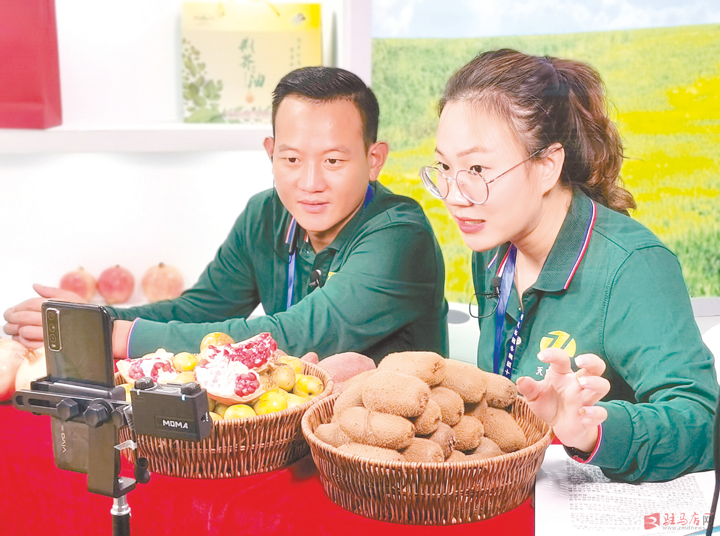 男女主播联手销售水果。
