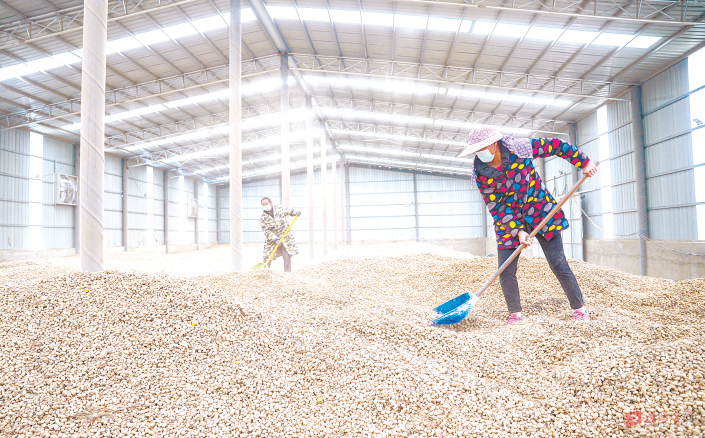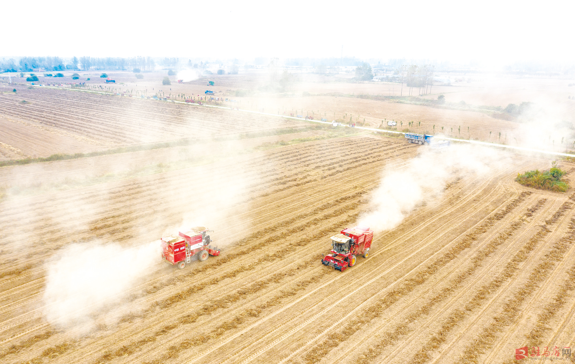 10月19日,40多台自走式花生捡拾摘果机在正阳县熊寨镇万亩花生田里来回穿梭,奏响丰收的欢歌。收获的籽大饱满的花生果被运回仓库,堆成了小山,好一派丰收繁忙景象。