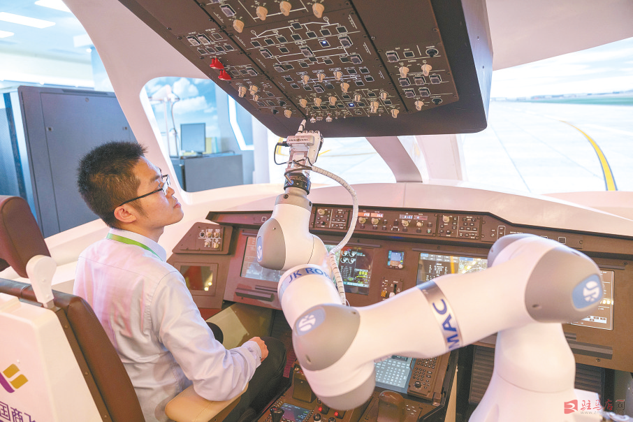10月21日,在北京展览馆举行的国家“十三五”科技创新成就展上,工作人员展示中国商飞公司的人机共驾智能飞行研究平台。