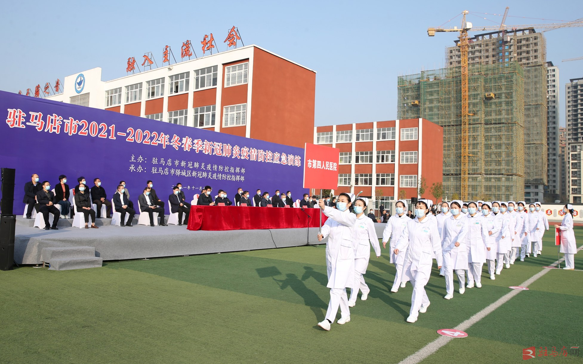 11月19日上午,驻马店市2021~2022年冬春季新冠肺炎疫情防控应急演练在市第三中学举行。 记者 弓华静 摄