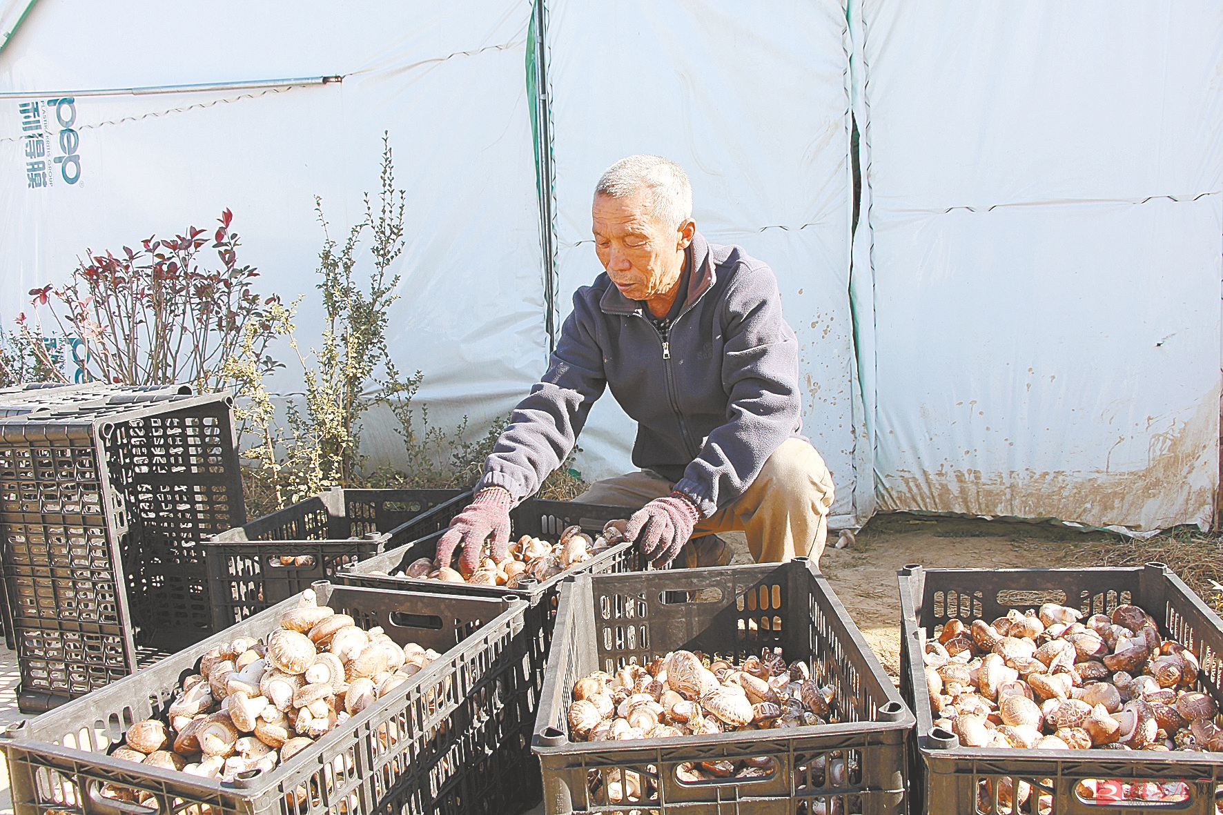 近年来,驿城区老河乡从一朵小香菇抓起,扩规模、延长产业链,打造香菇品牌,不断做大做强特色农产品,构建现代农业产业体系,增加农民收入、助力乡村振兴。图为近日,在位于该乡的九和农业种植有限公司香菇园,村民在采摘香菇。