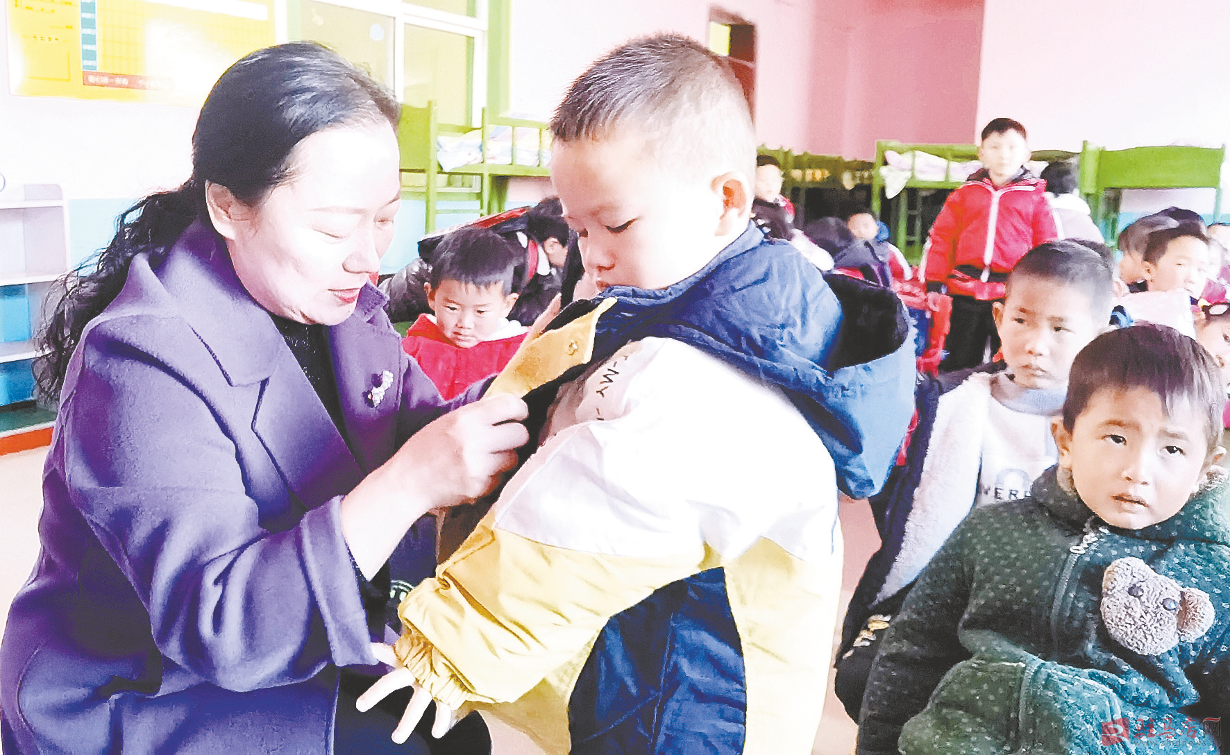 为孩子穿上新棉衣。