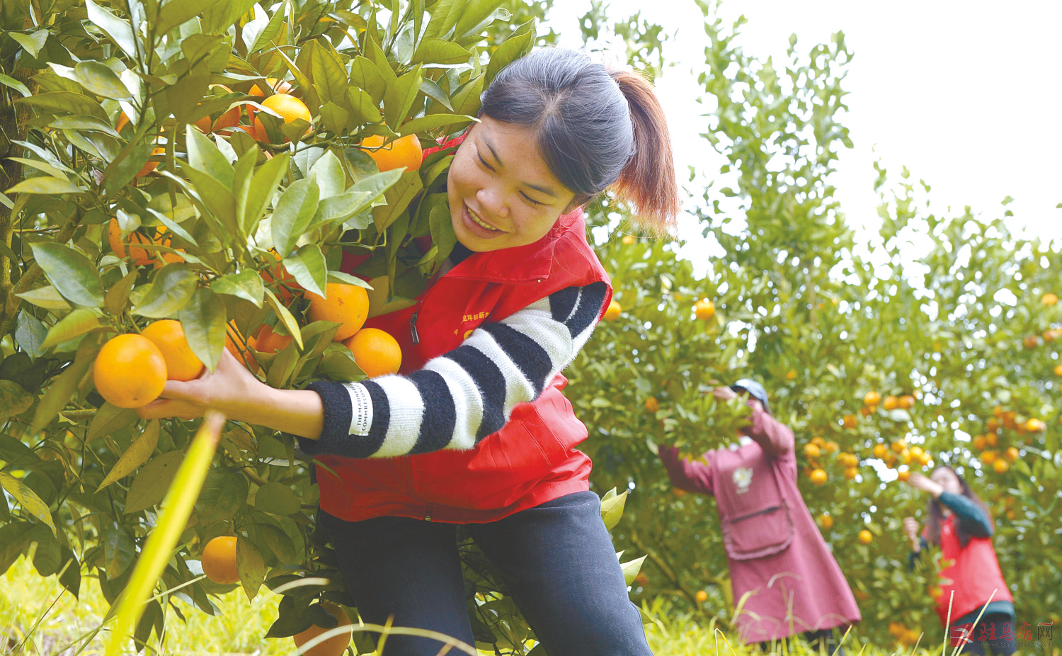 12月10日,村民和驻村干部在罗甸县龙坪镇顶访村脐橙种植基地采摘脐橙。 近年来,贵州省黔南布依族苗族自治州罗甸县调整农业产业结构,大力发展脐橙等水果种植。水果种植产业的发展带动当地村民通过土地流转、务工收入等方式实现增收。新华社记者 杨 楹 摄