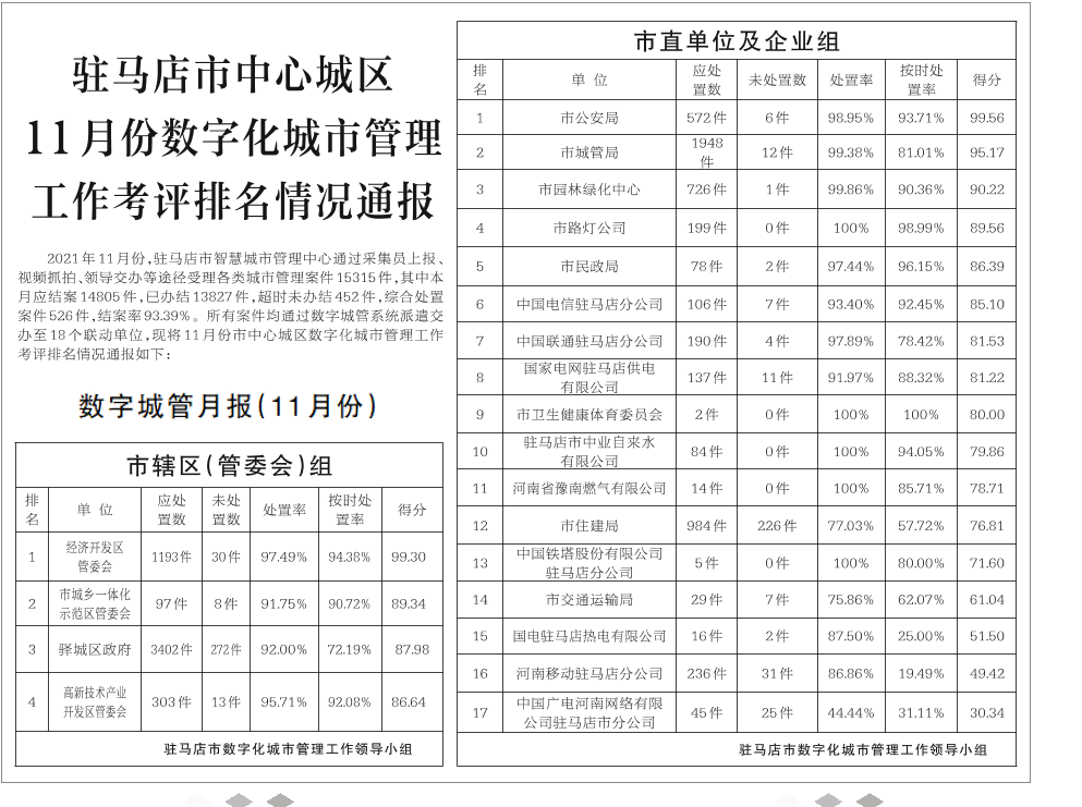 驻马店市中心城区 11月份数字化城市管理 工作考评排名情况通报