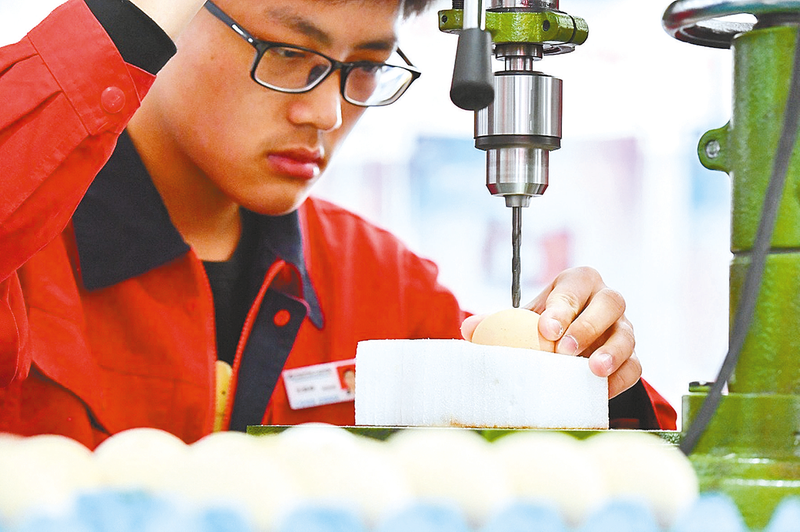 12月22日,在长沙贺龙体育中心,长沙汽车工业学校的学生在职业技能展演现场表演“鸡蛋上钻孔”。12月20日至22日,长沙市第一届职业技能大赛在湖南长沙举行,本次大赛的主题是“技攀高峰,能行天下”。 新华社记者 陈泽国 摄