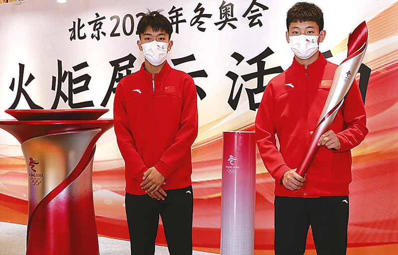 12月27日,第八届国际儿童冬季运动会速度滑冰冠军王梦奇和亚军刘梓涵(右)在活动现场展示冬奥会火炬。