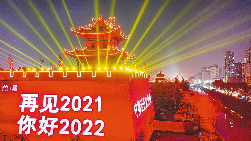 2021年12月31日拍摄的西安城墙灯光秀(无人机照片)。 新华社记者 陶 明 摄