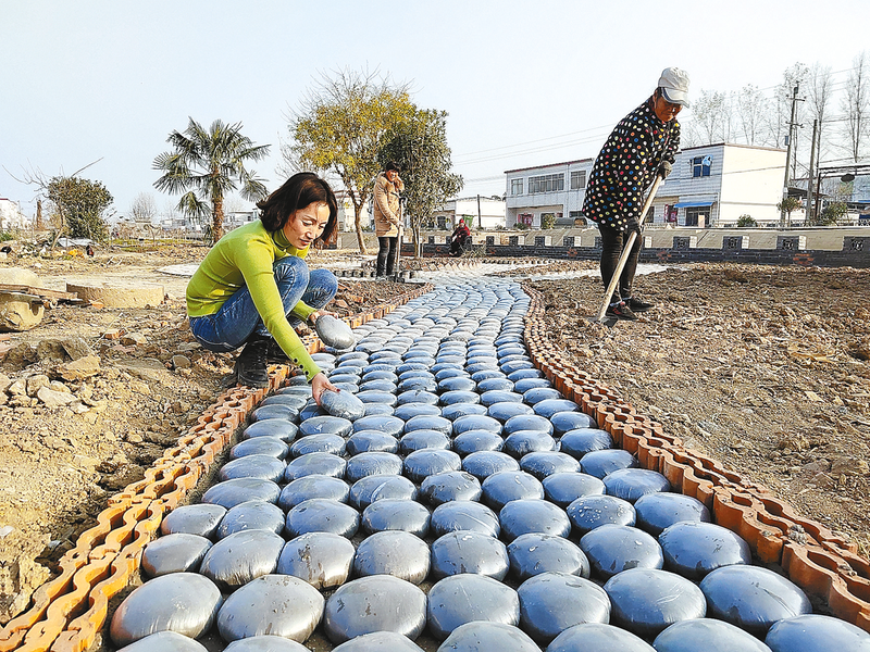 1月4日,正阳县兰青乡江店村群众在铺设村里的小游园人行道。近年来,兰青乡以推进农村生态文明建设、促进乡村全面发展为工作主线,以环境整治、垃圾治理为工作重点,推进村容村貌改善,打造宜居乡村,提升群众幸福感。