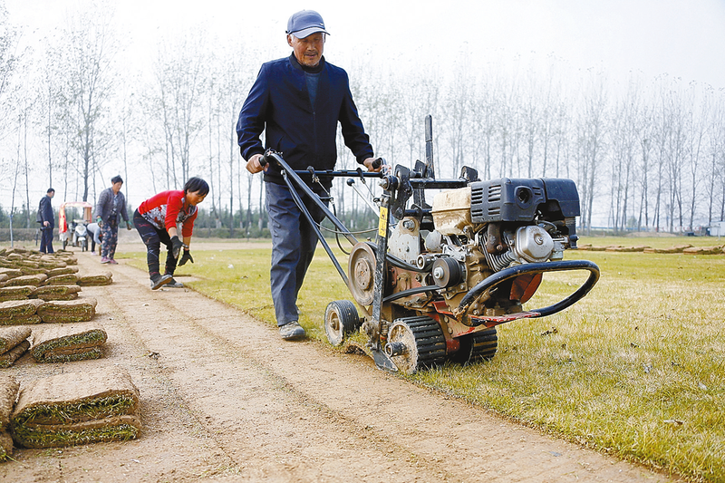 近日,几名工人在驿城区水屯镇余冢村河南百兴园林草坪种植基地割草皮。据悉,该基地流转土地面积140亩,主要种植、销售园林草皮,产品供不应求。