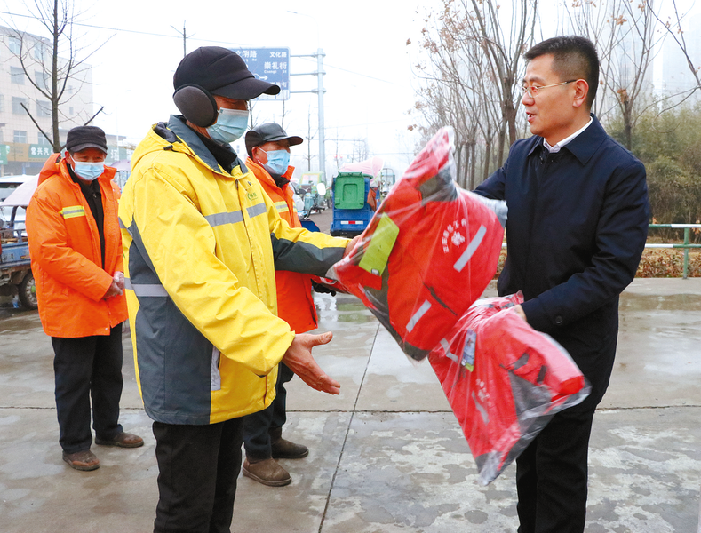 1月5日,正阳县“双节”送温暖慰问组来到正阳清尘环保技术有限公司,将县总工会捐赠的560套爱心棉衣送到环卫工人手中,送去党和政府的关怀,感谢环卫工人为城市的清洁美丽作出的贡献。