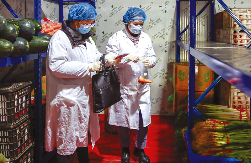 执法人员对蔬菜采样留存。 近日,市市场监管局组织执法人员对正阳县第二高级中学、正阳县第一实验学校的食堂进行突击检查。