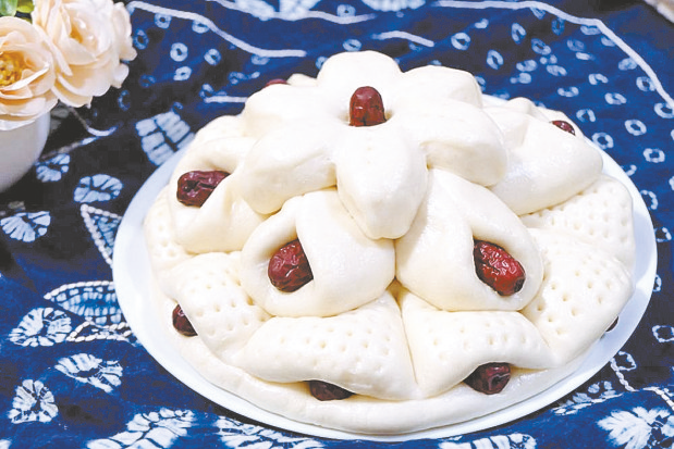 枣花,是枣花馍的简称,乡下老家的春节面食之一。河南“75·8”大洪水过后的第一个除夕夜,堂屋供桌上,一个特别大的枣花,时刻诱惑着我的味蕾。1975年8月,一场百年不遇的大洪水冲毁了家园,也冲走了家里的一切。政府开展救济工作,乡亲们也积极自救。年末月底,春节临近,大灾之年的家乡,年味儿日趋浓郁。“二十八,蒸枣花。”蒸枣花依然是母亲准备年货的必选项目。准备蒸枣花了,母亲在面粉中拌入发酵粉加水揉成光滑的面团,等发酵至两倍大,取出面团,放在案板上,不断加入面粉,反复揉搓,一直揉搓至面团切开后没有气孔,分成小面团,揉圆,擀成厚薄均匀的圆饼,继续揉搓出一些拇指般粗细的圆柱形长面条,用手挽成各种花瓣形状,拿模具在花瓣上压出花纹。最后,在花纹的中心放上一颗大红枣,白面红枣、相互映衬、巧妙组合,宛如含着花蕊盛开的鲜花,色香味俱佳,很吸引眼球。母亲做枣花就像蒸馍一样熟练,面团在母亲的两手中不断变化,一会儿是栩栩如生的玉兔,一会儿是憨态可掬的小熊,一会儿是张牙舞爪的蜈蚣,一会儿是翱翔蓝天的小鸟,就连做出来的小狗也似乎在摇头摆尾。待蒸熟后涂上红、黄、绿等食用色素,再用小红豆或者小黑豆点缀为眼睛,憨态可掬、活灵活现的动物造型的枣花就完成了。与往年不同的是,母亲特意把今年的枣花馍坯子做成山形,红白相间、层层叠叠,特别大。母亲说,这是大枣山,是咱赵家的富贵山、幸福山。