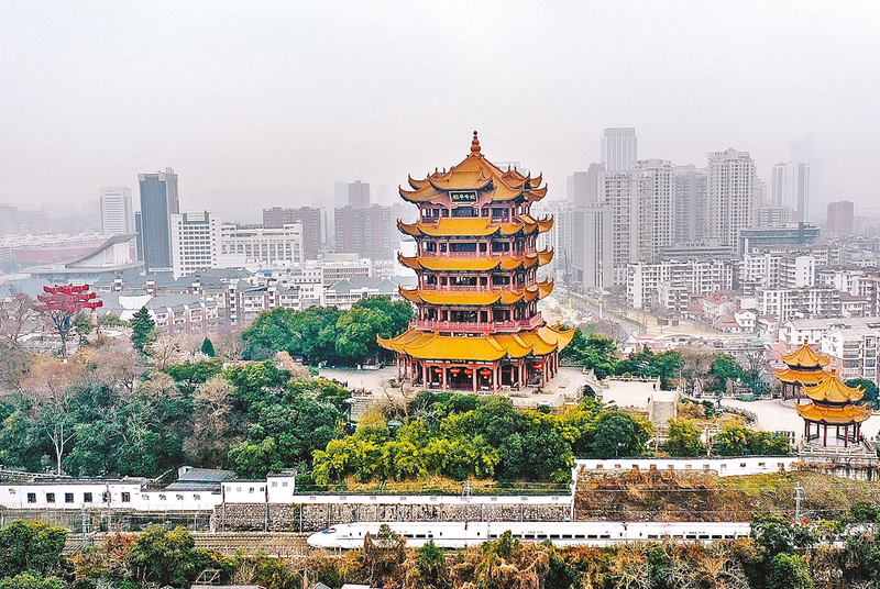 1月9日,一趟动车组列车经过武汉黄鹤楼景区(无人机照片)。