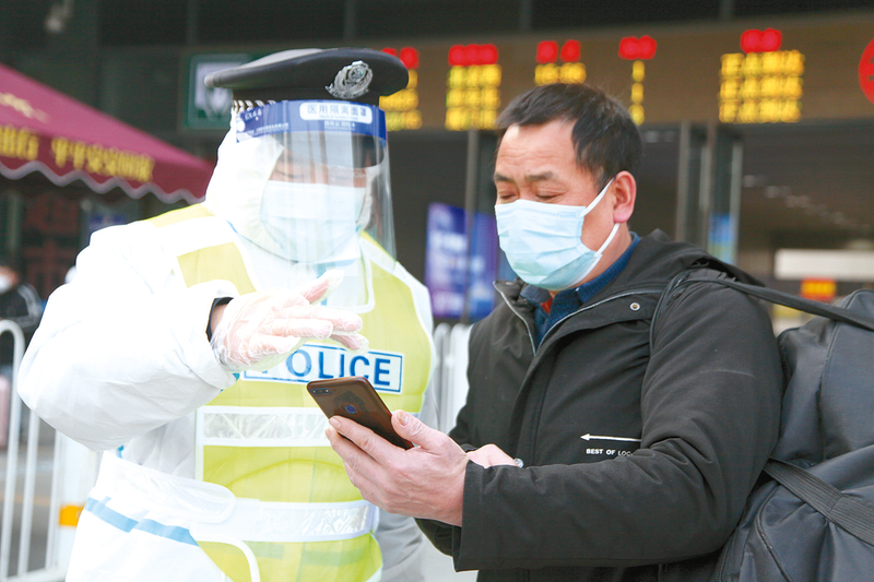 1月11日,市公安局城乡一体化示范区分局驻马店西站执勤点民警正在查验返乡旅客的健康码、行程卡和48小时核酸检测证明。