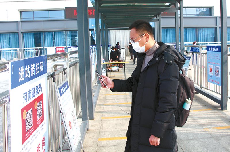 1月11日下午,驻马店火车站乘客在按照疫情防控规定扫健康码和行程码后进站。