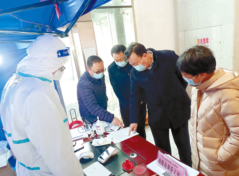 连日来,驿城区压紧压实责任,凝聚各方合力,严格落实“外防输入、内防反弹”各项举措,扎紧“四个口袋”,持续加大对城区重点部位和窗口单位的管控力度,严格落实好体温测量、佩戴口罩、扫码登记、消毒消杀、“一米线”等防控措施,切实做到疫情防控全覆盖、无缝隙。图为市、区有关人员督导检查市第二中医院核酸检测登记工作。