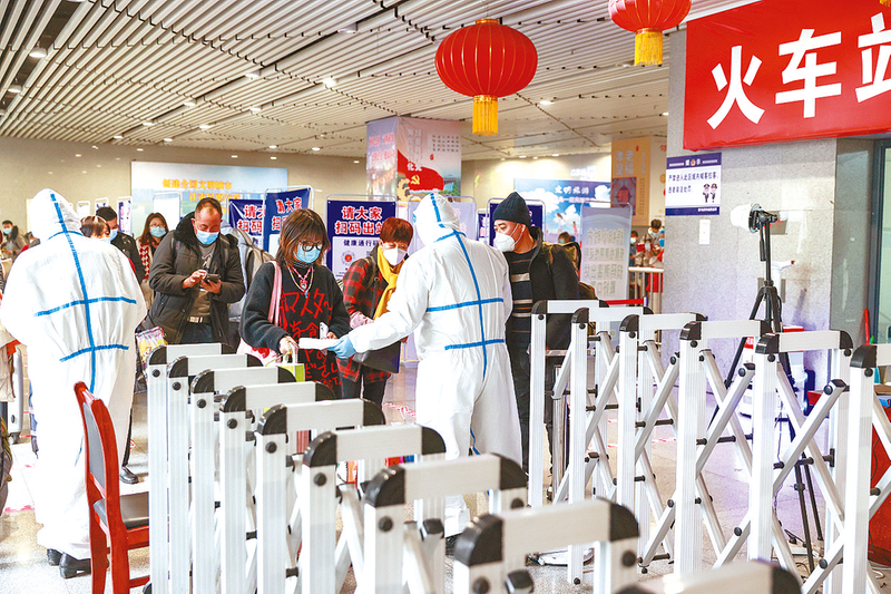 连日来,驿城区上下齐心协力、众志成城,筑起了疫情防控的铜墙铁壁。图为工作人员检查驻马店火车站出站乘客的健康码和行程码。