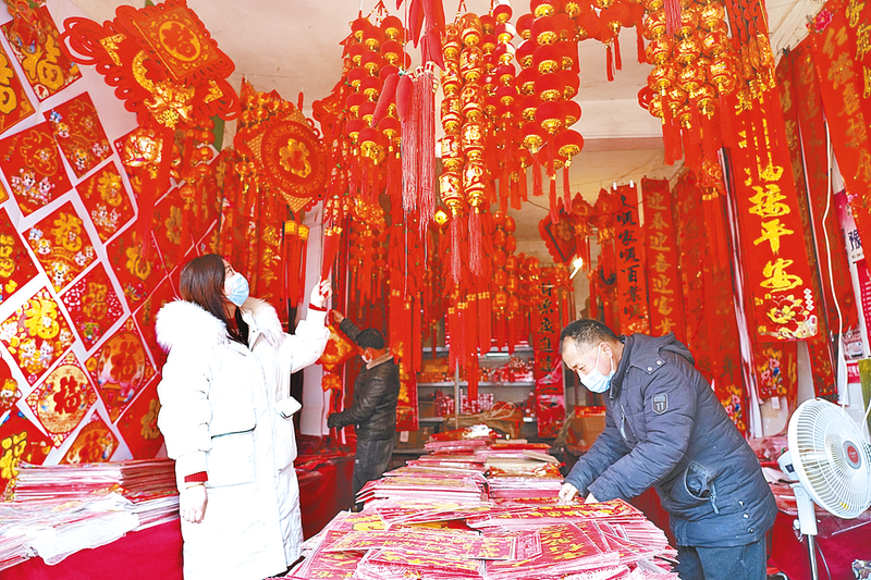 1月13日,正阳县群众在选购吉祥饰品。随着虎年春节临近,正阳县除了灯笼、门贴、福字、窗花、挂鞭等吉祥饰品之外,各种各样的生肖卡通虎也纷纷上架亮相。