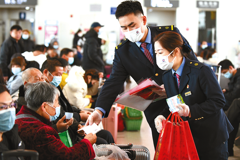 1月16日,在常州站候车室,铁路工作人员在给候车旅客发放备用口罩和防疫福袋。春运大幕即将开启,常州火车站举办“防疫同行 平安相伴”旅客出行宣传服务活动,引导乘车旅客正确佩戴口罩、遵守出行疫情防控规定,确保安全健康出行。 新华社发