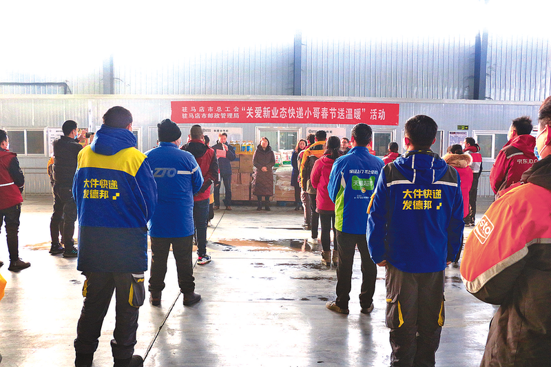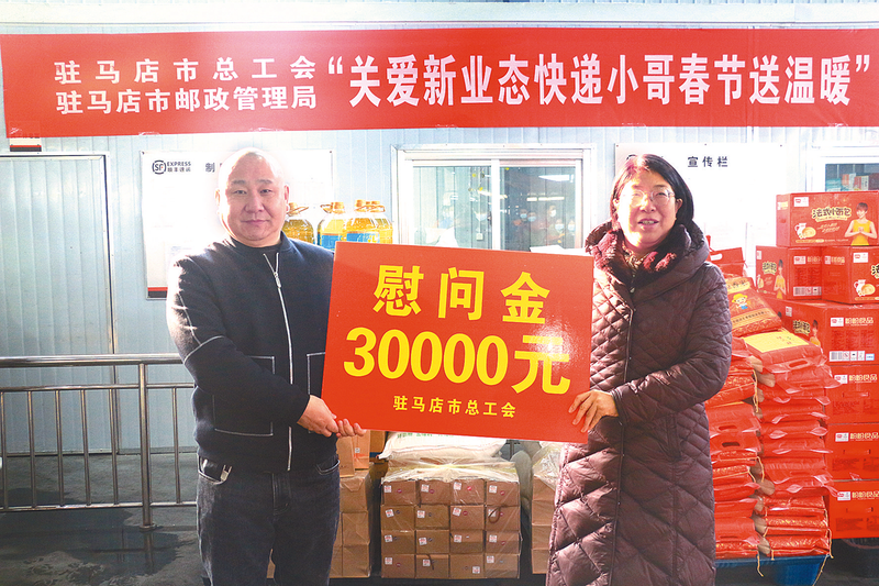 暖心寄语。 1月25日上午9时30分,在驻马店市恒兴仓储物流园里,由市总工会、市邮政管理局联合举办的“关爱新业态快递小哥春节送温暖”活动,温暖了在场的每位快递小哥,他们不仅领到慰问金,还领到了米、面、油等生活物资。