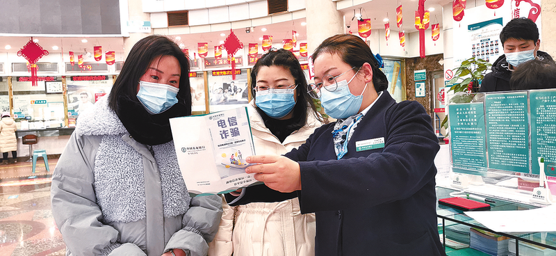 为提高个人资金安全意识,切实保障群众财产安全,1月24日,农行驻马店分行开展了防电信诈骗宣传活动。图为该行员工向客户进行防电信诈骗知识宣传。