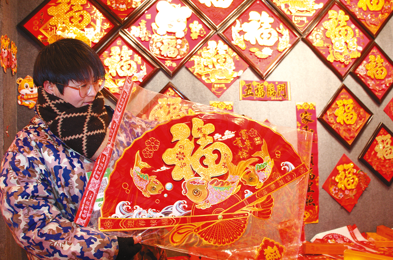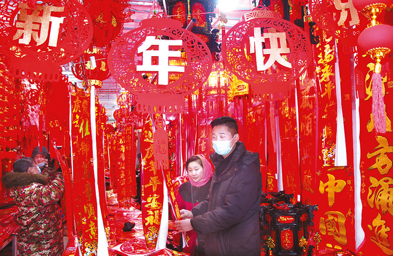 春节即将到来之际,市区各个年画市场和饰品店里挂满了各式各样的对联、年画,让人感觉特别喜庆,与虎年有关的贴画和饰品更是惹人喜爱。1月27日,市民在位于交通路的年画市场选购春节装饰品。