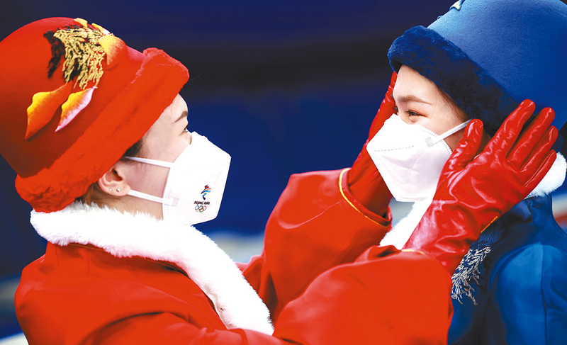 1月27日,礼仪人员在“冰立方”演练时互相整理衣帽。