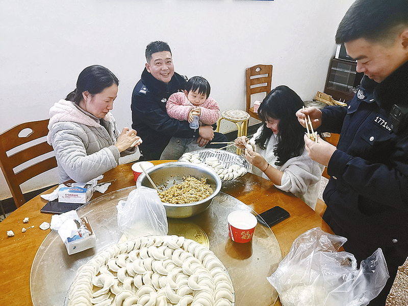 在雷寨公安派出所过年的警嫂还有所长周军的妻子,她也带着2岁的女儿到派出所陪伴丈夫。除夕夜,两位警嫂与民警辅警忙里忙外准备年夜饭。看到妻子忙碌的身影,周军笑着对大伙儿说:“你们嫂子是个自来熟,过节的状态和家里一个样。”话语刚落,整个餐厅便洋溢起欢乐的笑声。此刻,不难理解的是,警察光荣,警嫂不易,她们在丈夫的身后无悔奔赴,鼎力支持,默默奉献,成就了这份坚守中的团圆。