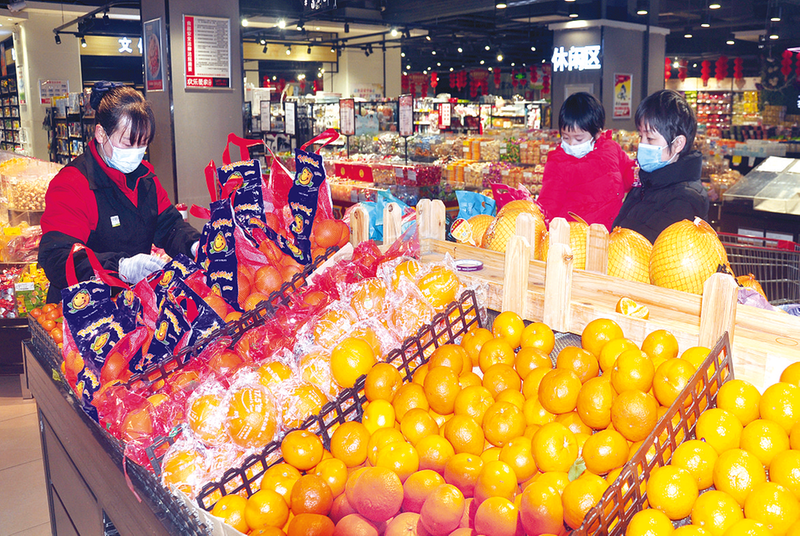 春节期间,我市各大超市为市民准备了充足的商品。图为市民在市区雪松大道爱家超市选购水果。 记者 郭连山 摄