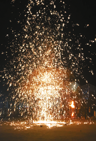 2月6日,农历大年初六,国家级非物质文化遗产确山打铁花在老乐山风景区精彩上演,现场震撼人心,受到广大群众的热烈欢迎。 记者 刘 华 摄