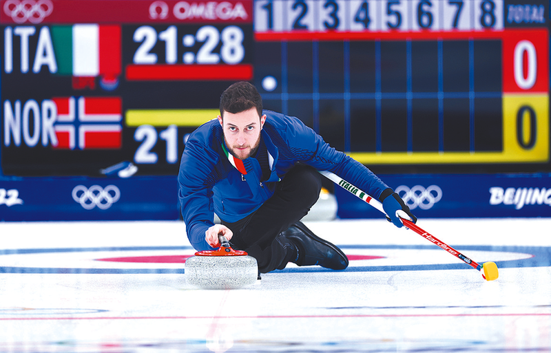 2月8日,意大利队选手阿莫斯·莫萨纳在北京2022年冬奥会冰壶混双金牌比赛中。 新华社记者 王婧嫱 摄