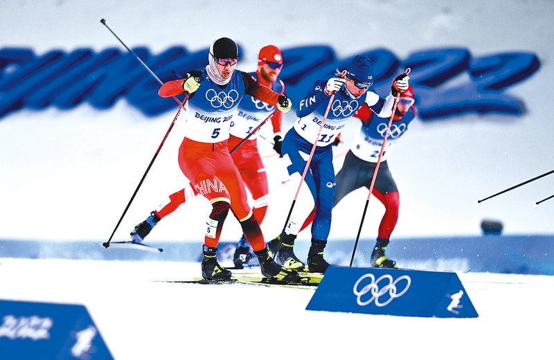 2月8日,中国选手王强(左一)在北京2022年冬奥会越野滑雪男子个人短距离(自由技术)1/4决赛中。 新华社记者 张宏祥 摄