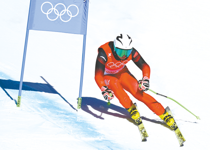 2月8日,中国选手张洋铭在北京2022年冬奥会高山滑雪男子超级大回转比赛中。 新华社记者 连 振 摄