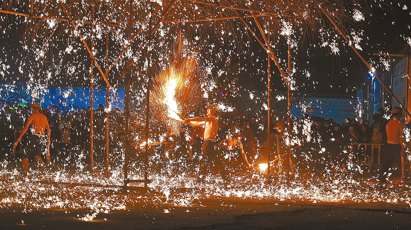 2月10日晚,在驻马店市确山县老乐山景区,一场持续一个多小时的国家级非物质文化遗产——打铁花表演举行。一串串耀眼的铁花在黑暗中向四周飞去,灿烂夺目、蔚为壮观。