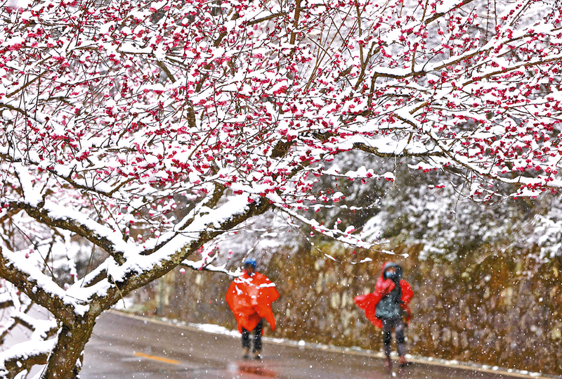 2月22日,游人在湖南张家界景区黄石寨梅园踏雪赏梅。