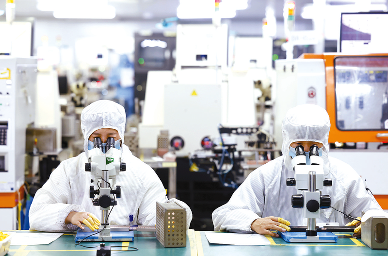 2月23日,在泗洪经济开发区一电子企业生产车间内,工人生产出口的芯片。新春伊始,江苏省宿迁市泗洪经济开发区企业迎来大批订单,各企业争分夺秒抓进度,开足马力赶订单。 新华社发