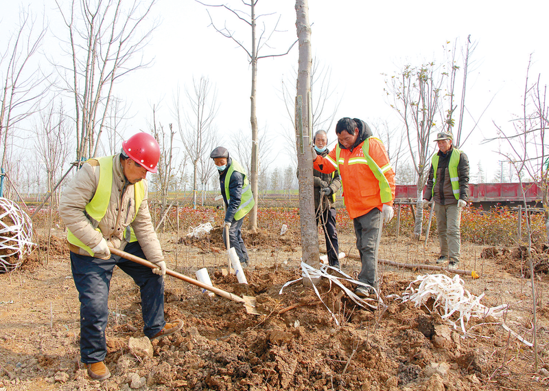 2月24日,在市区嫘祖大道旁的绿化带,几名园林工人挥锹铲土、挖坑栽苗、培土浇水,栽下一棵棵树苗。