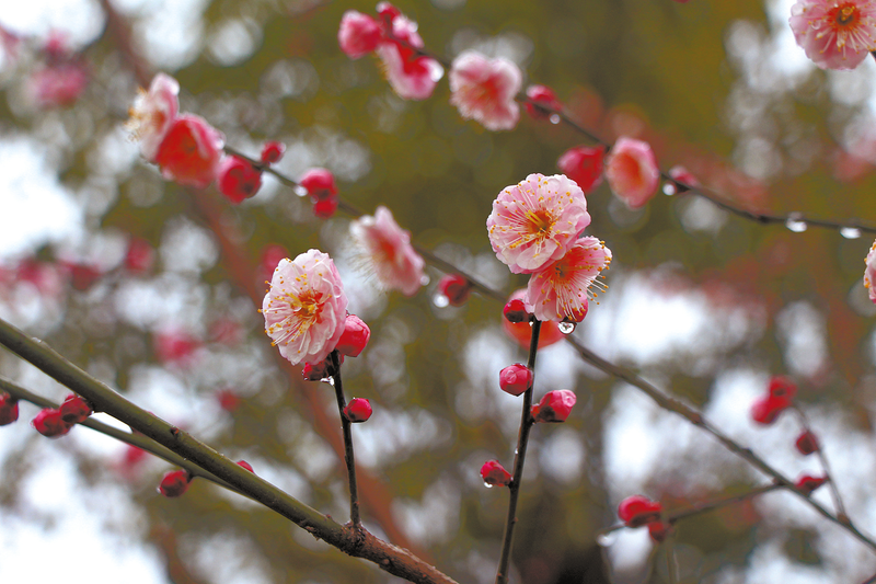 2月17日,凌晨的雪化成清晨的水,汝南县小西湖公园内盛开的梅花显得格外清秀迷人。 2