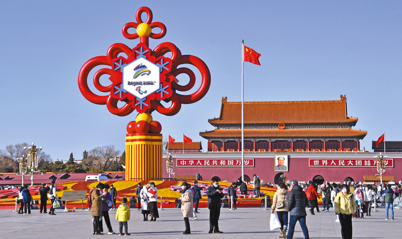 这是2月27日拍摄的已完成北京冬残奥会会徽更换的天安门广场“精彩冬奥”主题花坛。
