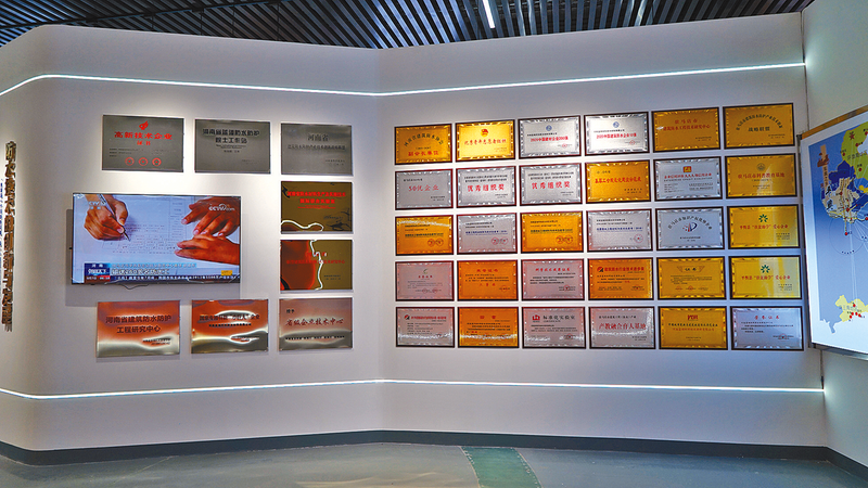 2月26日,伴着春天的脚步,笔者来到位于平舆县的河南蓝翎环科防水材料有限公司(以下简称蓝翎环科),踏进蓝翎环科高端大气的科技展厅,扑面而来的是一种浓厚的企业文化:诚实守信、忠诚敬业,凝心聚力、修德敬业……在宽敞的展厅形象墙上挂满了相框,不是公司获奖的瞬间记录,就是公司在全国知名项目的防水施工现场照,更多的是公司在建筑防水材料领域取得的技术专利证书。
