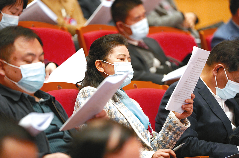 人大代表审议政府工作报告。 记者 吴 波 摄