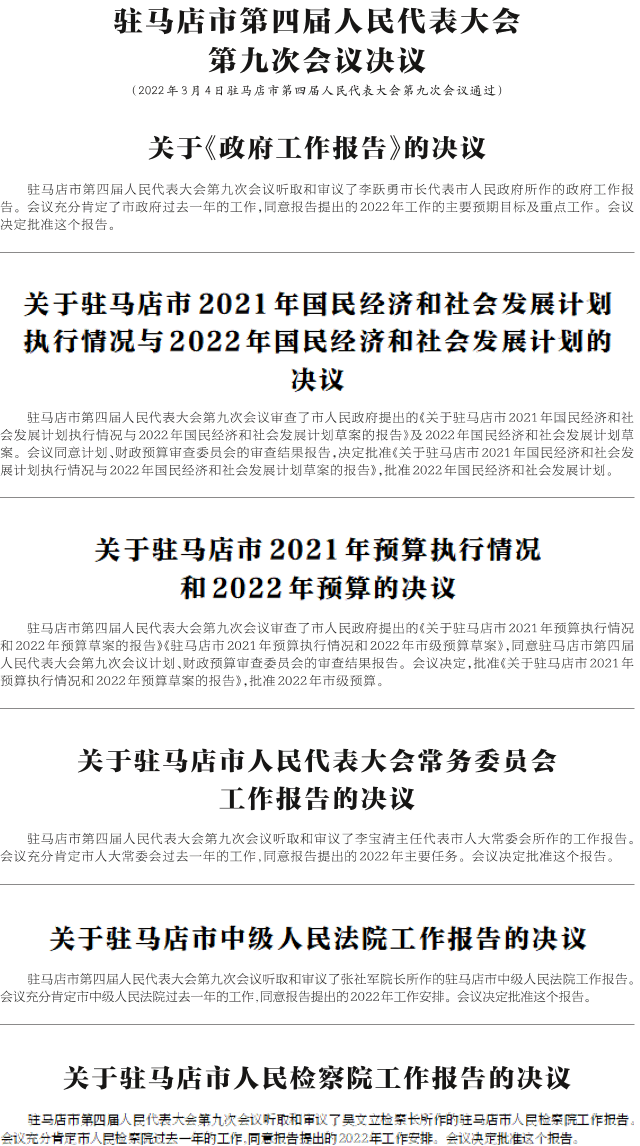 驻马店市第四届人民代表大会第九次会议决议