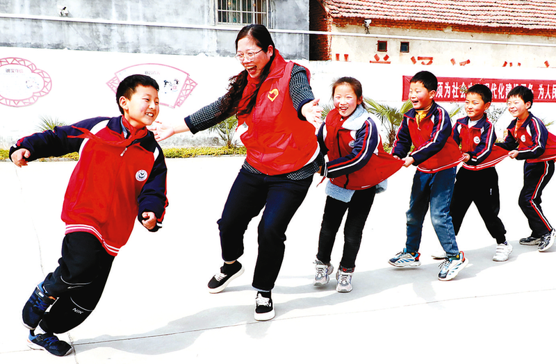 志愿者和留守儿童玩游戏。 记者 王 伟 摄