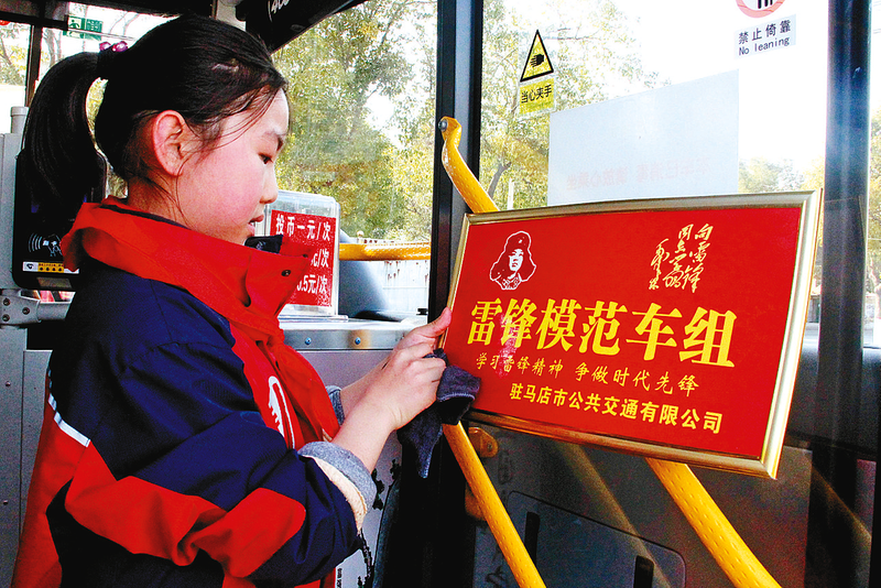 驻马店市第一小学的学生学雷锋走进公交车站。 通讯员 杨黎雯 摄
