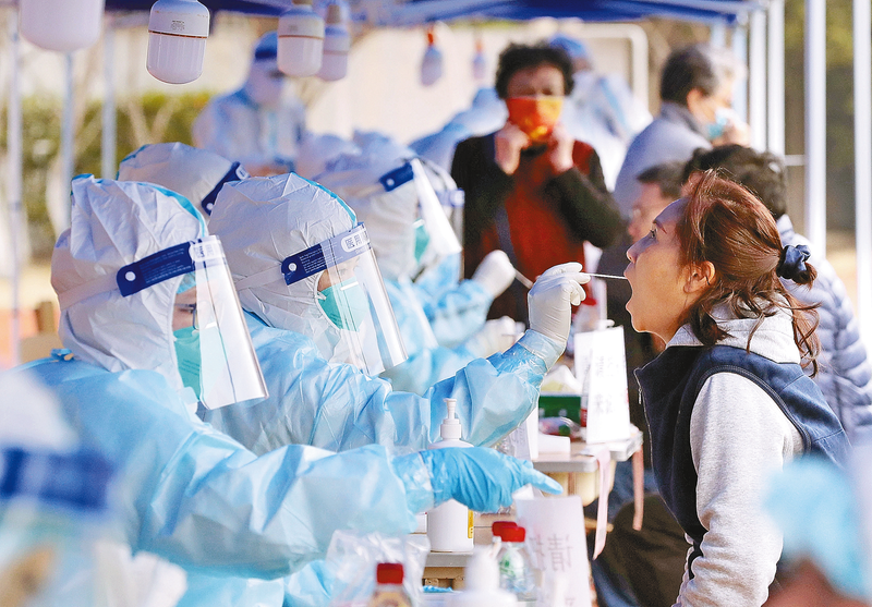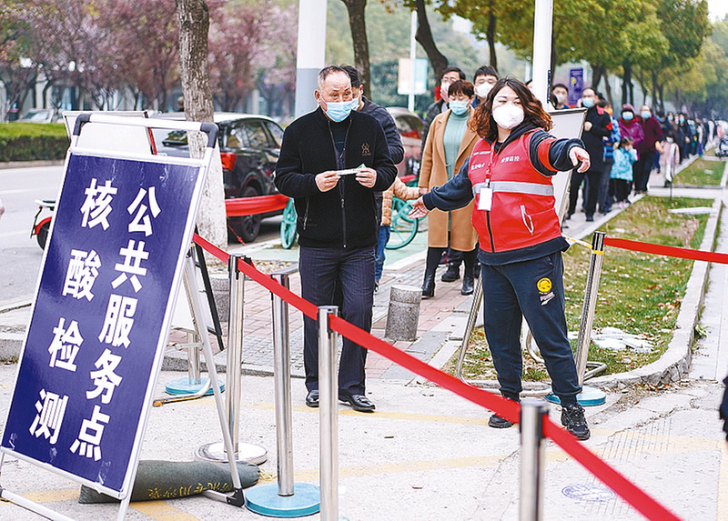 3月19日,志愿者在江宁区一处核酸检测点维持秩序。从3月17日开始,南京市分区分街道开展大规模核酸筛查,至18日21时,已采样762.06万人份、出结果543.81万人份,部分重点区域已完成多轮核酸检测。 新华社记者 季春鹏 摄