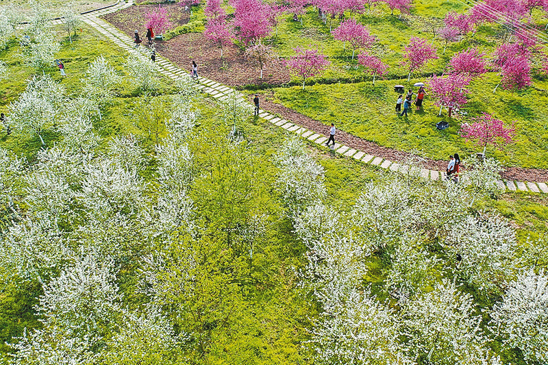3月19日,游客在位于重庆市大足区棠香街道的海棠园内赏花(无人机照片)。春分时节,人们在温暖和煦的春风中踏青、赏花,乐享春日美景。