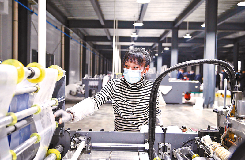 3月20日,西平县包装材料产业园里,工人正在操作设备,加工可降解塑料袋。西平县依托塑料制品独特的销售网络优势,为占据更大市场份额,提高塑料制品科技含量,投资20亿元建设了包装材料产业园。