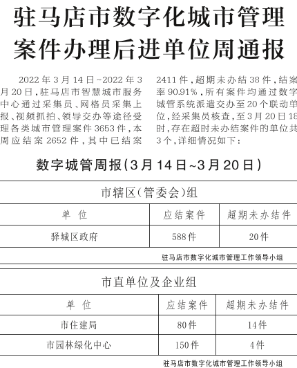 驻马店市数字化城市管理案件办理后进单位周通报