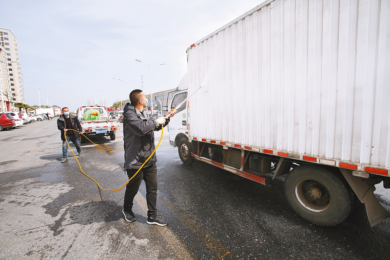 3月29日,在驻马店恒兴仓储物流园区二期入口处,园区工作人员对每辆进入园区的通勤车进行全面消杀。